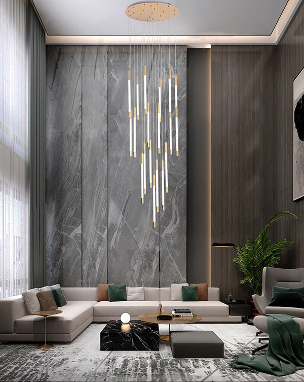 The 70 Collection is inspired by the multitude of configurations in which it can create. The clusters of acrylic tubes are suspended from slimline ceiling plates and connected using minimal end caps in gold plates. the final installations can be simply toggled between a static, dimmable light, and the animated rain-like effect with each tube displaying a unique randomly generated flow of light. The original sculpture’s gentle rain-like aesthetic has evolved into a residential scale product that evokes a sense of calm wonder as a stunning lighting centerpiece. Within the compositions, drops of light glide effortlessly down the length of each tube, providing cascading light in a constant state of flux; perfect for a stairwell where the movement reflects the transition between floors during each day.