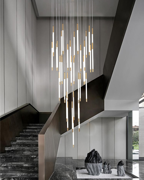 The 70 Collection is inspired by the multitude of configurations in which it can create. The clusters of acrylic tubes are suspended from slimline ceiling plates and connected using minimal end caps in gold plates. the final installations can be simply toggled between a static, dimmable light, and the animated rain-like effect with each tube displaying a unique randomly generated flow of light. The original sculpture’s gentle rain-like aesthetic has evolved into a residential scale product that evokes a sense of calm wonder as a stunning lighting centerpiece. Within the compositions, drops of light glide effortlessly down the length of each tube, providing cascading light in a constant state of flux; perfect for a stairwell where the movement reflects the transition between floors during each day.