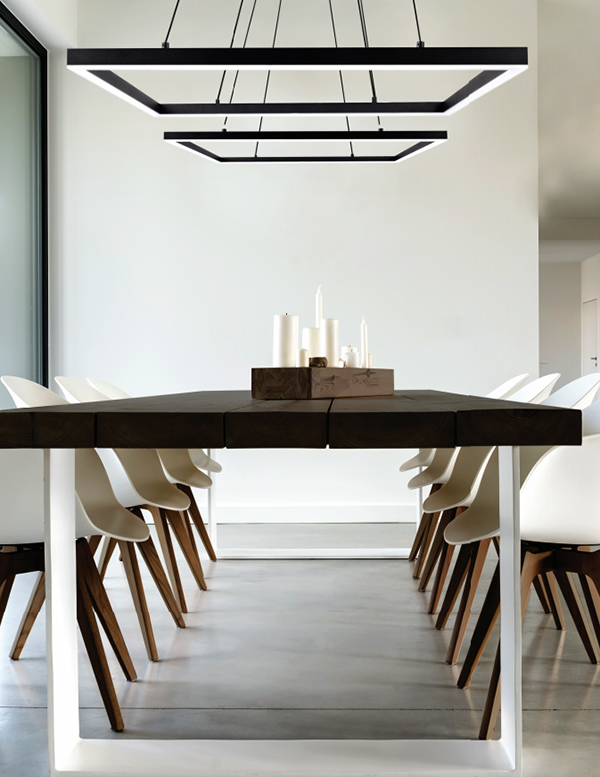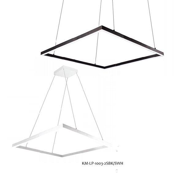 A suspended rectilinear frame emits soft luminance downward from the continuous perimeter opal diffuser. Veiled within the aluminum extrusion is a secondary set of LED lights sending ambient illumination up toward the ceiling. Modern linear pendant lights dimming light keep true to their most minimal yet sleek form with metallic finishes, with all eyes on the bars of illumination. This collection fits almost any design and styling needs. Available in Black&White finishes. Custom finishes are available upon request.