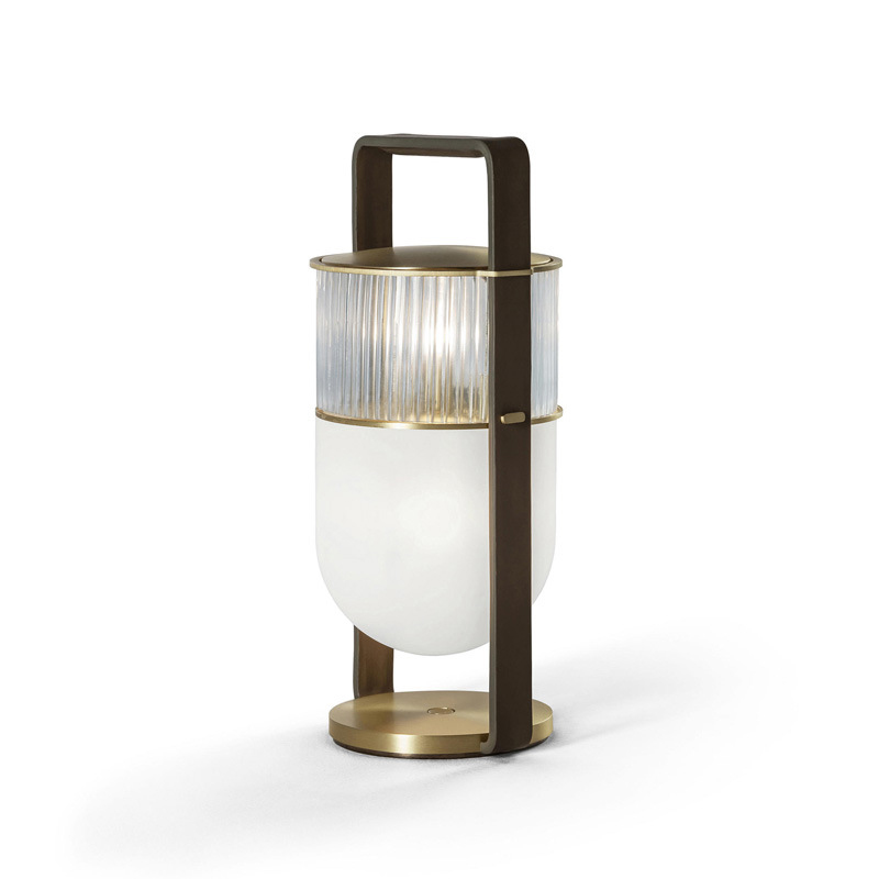 This is a table lamp on a metal base with a natural brass finish. The leather strap can be used as a support or a handle, and there are 2 different finishes to choose from. The light can be adjusted by the on/off touch dimming system.